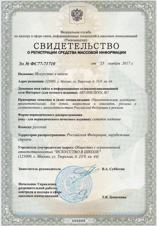 Сайт "Искусство в школе" зарегистрирован как сетевое издание. Свидетельство о регистрации ЭЛ № ФС 77 - 71710 от 23.11.2017 г.
