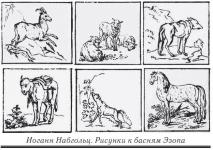Басня... может быть, естественно: или прозаическая, в которой вымысел без всяких украшений ограничивается одним только простым рассказом и служит только прозрачным покровом нравственной истины; или стихотворная, в которой вымысел украшен всеми богатствами поэзии, в которой главный предмет стихотворца, запечатлевая в уме нравственную истину, должен нравиться воображению и трогать чувство.