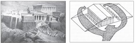 Эта дорога извилистая на протяжении восхождения, на самом Акрополе она выравнивается и выводит нас не к фасаду храма, а ориентирована на его угол. (В Египте аллея сфинксов направлена строго перпендикулярно к пилону храма.)