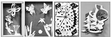 Задачи: закрепить знания о силуэте предметов. Познакомить с приёмами работы с бумагой: "форточки", надрез, сгибание прорезного силуэта". Познакомить с понятием "Полуо6ъёмная форма" в ДПИ.