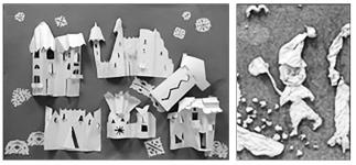 Изначально оговариваем и выбираем силуэт для своего дворца: высокий, низкий, широкий, узкий; решаем, из чего состоит здание (башни, крыши, переход из одной части здания в другую). затем придумываем форму; обсуждаем, как можно согнуть лист бумаги с помощью надреза ножницами по плоскости листа (приподнимая деталь над плоскостью), чтобы пластическая форма была интересной. Далее обогащаем форму декоративными элементами, например, окна – использованием прорезных силуэтов или "форточек", балконы – использованием гармошки или сгибания детали с прорезными элементами и т.д. В ходе работы дети приобретают навыки коллективного творчества. Все выполненные элементы компонуются на один большой лист тонированной бумаги. Если в предыдущем упражнении геометрическая форма была задана изначально (получался цилиндр, прямоугольник, конус), то в этом задании форма здания произвольная; это заставляет детей проявить свое образное мышление, воображение.