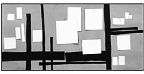 Далее знакомимся с понятием «формат» (горизонтальный, вертикальный). В начале урока оговариваем, какие бывают форматы листа – рабочей плоскости, на которой будет раскрыта тема. Выбираем горизонталь. Оговариваем, почему горизонталь к нашей работе подойдет больше: так как наш город расположен вдоль реки Кан. знакомимся с формой – квадрат, прямоугольник. Беседуем о том, какие районы и достопримечательности есть в нашем городе. Это новостройки, высотные дома, которые представляют форму прямоугольника, и деревянные (маленькие, по сравнению с 9-этажными) постройки – в нашей работе они будут представлять форму квадрата. Эти районы "связаны" между собой дорогами: проезжей частью и тротуарами, которые, в свою очередь, будут представлены прямоугольными полосками разной ширины и длины. Сделав заготовки домов (предварительно оговаривая размеры деталей относительно формата), обучающиеся располагают их на формате, двигая элементы домов и дорог, создавая композицию, смотрят, как эти дома располагаются относительно друг друга, перекрывая детали, где находится "проезжая часть", а где "тротуар", или просто тропинки. 3а основу берём чёрный и белый цвет элементов и располагаем их на тонированной бумаге.