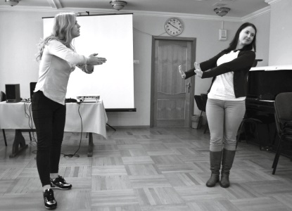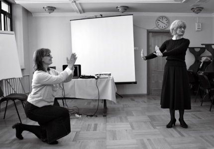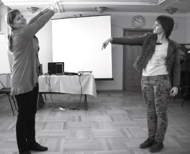 Как правило, участники занятия становятся к центральной фигуре спиной и смотрят на преподавателей. Тогда им предлагается вспомнить, что центр не там, где педагоги, а у противоположной стены. И нужно найти положение тел относительно этого центра, при том, чтобы ни к кому не оказаться спиной.