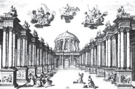 Выясняем, что планы выстраиваются наложением друг на друга с разрывами между собой. В точках наложения изображаются видимые границы (архитектурные сооружения или горы). Каждый план имеет своё цветовое решение: полноцветный передний план, коричнево-зелёные тона – средний, серо-голубые тона – дальний. Так же как в театральной декорации, на живописном полотне центр выделен символически значимыми архитектурными объектами (храмом, триумфальной аркой, обелиском). Кроме того, боковая часть переднего плана (портик античного храма) решена как явные театральные кулисы, а в среднем – мы видим аналогию кулисного пространства (выступающие ветви дерева).