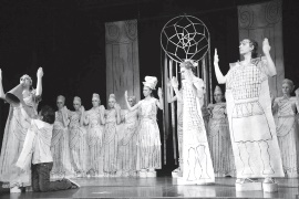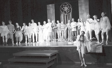 Вопрос о современности шекспировской комедии не стоял – на этом сошлись бесспорно. Заговорили мы с детьми об эпохе, их теперешней эпохе, когда «привязанности нашей молодёжи не в душах, а в концах ресниц, похоже…» Но при этом единственное, что нужно и шекспировским героям, и современным подросткам – это любовь. Эпоха «Сна…» – это не шекспировское время, не XVI век, это Древняя Греция, но как мне кажется, не классическая, а некоторая пародия на эту эпоху, иронический взгляд на неё. И вот нам предстояло соединить Шекспира, Древнюю Грецию и наш XXI век… Соединить, не потеряв иронии Шекспира. Способ нашёлся. Мы бесконечно повторяли мысль «Всем нужна любовь»… «All You Need Is Love», как пела когда-то известная «ливерпульская четвёрка»… Английский драматург, английский язык, английская группа, известная так же, как и Шекспир, во всем мире… «The Beatles» – поющие о любви, о свободе выбора, о протесте. Их эпоха стала эпохой протеста молодых против социальных устоев, эпоха хиппи, «детей цветов», эпоха свободы… Так возникла мысль соединить драматургию англичанина Шекспира с песнями англичан «битлов». Все были «за», и с восторгом, с упоением дети кинулись слушать «битлов» практически впервые в жизни, подбирая «арии» своим героям. Конфликта авторов не произошло. Напротив, получался интересный музыкальный спектакль, тексты «The Beatles» не противоречили пьесе, они дополняли диалоги и монологи героев. И вот, придя к такому соединению, к такому ходу, мы задумались о художественном решении спектакля. Не надо рассказывать, что когда ты думаешь над каким-то материалом постоянно, ты начинаешь видеть всё вокруг сквозь призму этого материала, мысли витают в воздухе и многие решения буквально врываются в тебя из этого воздуха. Однажды, на мастер-классе, плетя из ленточек «ловец снов», я увидела, что этот ловец и есть практически идеальная декорация к спектаклю… «Ловцы снов», «фенечки», все эти плетёнки – знаки именно эпохи хиппи, на которой мы остановились, благодаря «The Beatles». И эти кольца с «паутиной», в которую, словно в сон, попали герои пьесы, и эти ленты, среди которых так легко заблудиться… Так в одну секунду пришло сценографическое решение спектакля – гигантские ловцы снов – волшебный лес, в котором происходит основное действие. Ловцы зелёного цвета – лес, белого – греческие колонны. И так окончательно определились мы с костюмами – стиль хиппи.