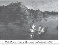 Молодой художник Николай Рерих представил великому русскому писателю дипломную картину "Гонец. Восстал род на род" (1897) и с трепетом ожидал решения Льва Николаевича. Обратясь к автору "Гонца", Толстой проговорил: "Случалось ли в лодке переезжать быстроходную реку? Надо всегда править выше того места, куда вам нужно, иначе снесёт. Так и в области нравственных требований надо всегда рулить выше – жизнь всё снесёт. Пусть ваш гонец высоко руль держит, тогда доплывёт!" [1, 3б]. И это благословение Льва Николаевича Рерих стремился исполнить.