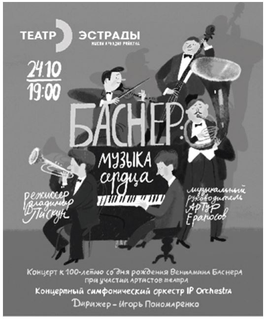 На сцене Театра Эстрады имени Аркадия Райкина состоялся спектакль-концерт «Баснер: Музыка сердца». Вечер памяти композитора Вениамина Баснера в год 100-летия со дня его рождения подготовили артисты Театра эстрады при участии Концертного симфонического оркестра IP Orchestra под управлением Игоря Пономаренко. В подборе музыкального материала театр консультировала супруга композитора, Лукерья Баснер.Режиссер – Владимир Пискун, лауреат Молодёжной премии Санкт-Петербурга в области художественного творчества.