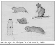 Для мастер-класса я решил подобрать два сюжета: облик и позы самцов сайгака зимой во время гона, когда они выглядят особенно эффектно, и поведение сусликов у норы, когда они часто принимают позу столбиком. Хотя в Интернете много видеоресурсов, найти точно то, что нужно - достаточно продолжительные по времени фрагменты, позволяющие спокойно всмотреться в зверей, их облик, поведение, - не так просто. Подходящие кадры мне удалось найти в фильме «Сайгаки» Л. Мухаметгалиева, В. Белялова (Казахфильм, 1987), а кадры сусликов были взяты из любительских видеосъемок, найденных в Интернете. Для третьего мастер-класса по просьбе организаторов мне пришлось подобрать видеокадры степного орла, вместо эпизодов по сайгаку. Школьникам было предложено нарисовать летящего орла и сидящего на гнезде птенца.