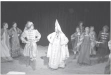 Ярко, зрелищно! Поют, пляшут, весело! По сюжету, например, герой пропал! Герой пропал – героиня сразу запела! По ходу действия наступила осень – на сцене листопад, учащиеся начальной школы кружатся в костюмах.