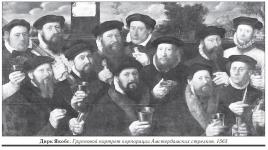 Начиная с середины XVI столетия изображения трех стрелковых корпораций Амстердама – лучников, арбалетчиков и аркебузиров, становятся важной темой живописи. Среди заказчиков групповых портретов особое место принадлежало гражданской милиции, следившей за безопасностью населения Амстердама. Историческими свидетельствами становятся оружие, одежда, выписанные на портретах стрелков с редкостной тщательностью и мастерством. На картине Якоба Лиона "Групповой портрет стрелков роты капитана Якоба Питерса Хогкамера и лейтенанта Питера Якобса ван Рейна" (1628) можно бесконечно разглядывать интерьер зала амстердамской корпорации арбалетчиков: выложенный черно-белыми плитками пол, камин с гербом города Амстердама, висящий на стене «"ортрет стрелков роты О" работы Дирка Барендса. Ещё больший интерес представляет вооружение и одежда мушкетёров, возглавляемых капитаном и лейтенантом (оба они были торговцами шёлком). Ленты с подвешенными пороховницами, туфли с бантами, воротники: огромные гофрированные испанские горгеры и отложные рабаты, по французской моде эпохи Людовика XIV; мушкеты, алебарды...