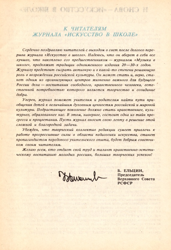 Сердечно поздравляю читателей с выходом в свет после долгого перерыва журнала «Искусство в школе». Надеюсь, что он вберет в себя все лучшее, что накоплено его предшественником — журналом «Музыка в школе», продолжит традиции одноименного издания 20—30-х годов. Журналу предстоит сыграть активную и в какой-то степени решающую роль в возрождении российской культуры. Он может стать и, верю, станет одним из организующих центров жизненно важного для будущего России дела — воспитания свободного, нравственного человека, естественной потребностью которого является творчество и созидание добра.