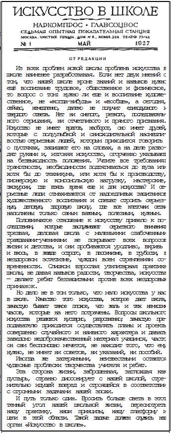 Итак, в 1991 году вышел первый номер журнала "Искусство в школе", и открылся он редакционной статьей, опубликованной в мае 1927 года в первом номере журнала... "Искусство в школе", написанной, скорее всего, наркомом Луначарским.