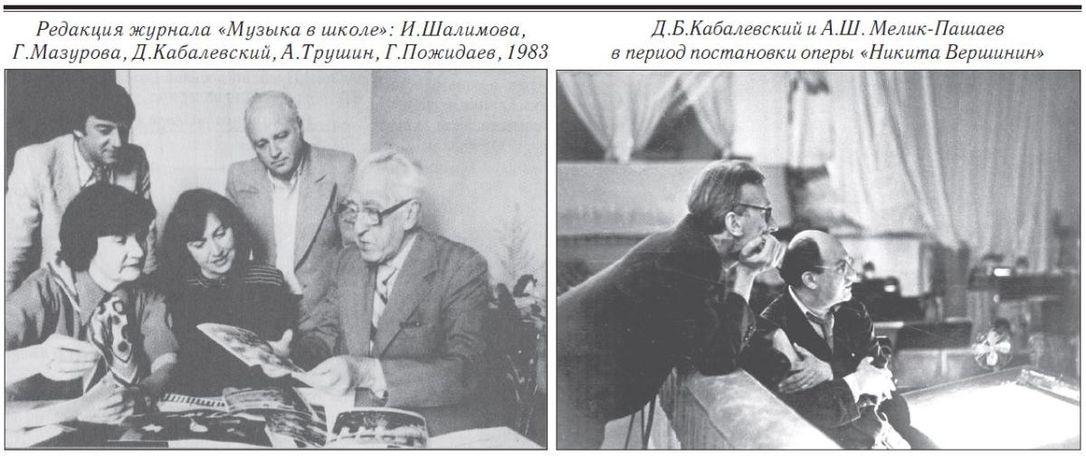 О Дмитрии Борисовиче у меня сохранились личные воспоминания. Первое из них - довольно раннее, но очень отчётливое. Это - врезавшийся в детскую память острый силуэт и облик человека громадного по тому времени роста, очень худого, со своеобразной пластикой движений и с чрезвычайно внятной, чётко артикулированной речью, который входит в нашу дверь и усаживается за рояль вместе с моим отцом. Тогда в Большом театре ставили оперу Кабалевского "Никита Вершинин", дирижировал Александр Шамильевич Мелик-Пашаев, и они обсуждали подробности будущей постановки, то и дело переходя от слов к музыке и обратно.