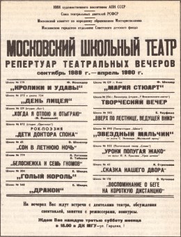 Третий год в Москве живет городской школьный театр. В конце 1986/87 учебного года в Москве в рамках Всесоюзного фестиваля народного творчества прошел смотр детских театральных коллективов дворцов и домов пионеров, общеобразовательных школ. Участие общеобразовательных школ в смотре носило случайный характер: организаторы смотра не проявили должной заинтересованности в участии школьных театральных коллективов (если из 37 детских театральных коллективов при районных домах пионеров и домах комсомольца и школьника на городской смотр вышло 17, то общеобразовательные школы города, а их более тысячи, были представлены лишь 14 коллективами), не хватало времени и на показ спектаклей школ — лауреатов фестиваля.