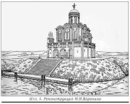 И, наконец, третье. Раскопки 50-х годов ХХ века под руководством одного из основных исследователей храма профессора Н.Н.Воронина показали: храм практически одновременно с постройкой основного объёма был окружен с трёх сторон (кроме алтаря) галереями шириной 2,5 метра. Специалисты спорят о том, какими они были и можно ли было ходить по их верху. Но, как бы то ни было: стремительный вертикальный взлёт общего объёма здания сменяется в этом случае плавным ступенчатым нарастанием архитектурных масс. Храм из тонкой «свечи» мгновенно превращается в могучее и даже грозное сооружение, особенно если представить его себе стоящим на первоначальном белокаменном подиуме (илл. 5, 6). Это уже не «белая царевна», вышедшая к реке! Здесь для поэтической характеристики понадобится мужской род…