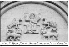 Придётся оговориться: колокольни в церкви Покрова в XII веке не было, потому что тогда на Руси не было колоколов. Они появились в Западной Европе, и только в XIII веке, а на Русь пришли ещё позже. Но и сам этот храм стал своего рода «звуком» – молитвой в камне, для которой важны не только слова, но и мелодия, и ритм. Не случайно на его западном, самом значительном фасаде находится скульптурный рельеф с изображением царя-пророка Давида, играющего на псалтири – струнном музыкальном инструменте, похожем на арфу (илл. 7). Слово «псалтирь» перешло и в название сборника, включающего более 150 молитв для чтения и пения — псалмов. Церковные песнопения звучали не только внутри, но и снаружи, у стен этого храма. Особенно часто — во время крестного хода на Пасху, который повторяется затем ежедневно в течение всей пасхальной седмицы (недели). Крестный ход с пением и чтением Евангелия проводился здесь также по особым случаям. И в первую очередь – в день престольного праздника, Покрова Пресвятой Богородицы. Праздник отмечается по церковному календарю 1-го (по новому стилю – 14-го) октября.