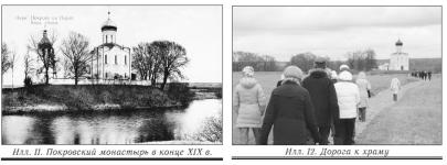 Разумеется, даже при общем высоком уровне строительства, шедевров, как и всегда, было немного. Храм Покрова на Нерли, счастливо сохранившийся, – один из них. Подводя итог, вернёмся к тому, с чего начинали, – к современному виду этого храма. Он, безусловно, привлекает и вдохновляет многих людей. Немалую роль в этом играет его во многом уникальное расположение – «среди долины ровныя, на гладкой высоте». Рядом – никаких строений, кроме одноэтажного домика с зеленоватой крышей, расположенного в нескольких десятках метров от храма, за его алтарем. Кажется, что и он — лишний. Однако это не так. «Домик» – остатки бывшей Трёхсвятительской церкви постройки 1884 года, раньше на её месте стояла деревянная. А если посмотреть альбом «Владимир в старой открытке» [7] и найти, как выглядел храм Покрова в то время (илл. 11), видно: рядом с ним не одно, а много строений – тяжёлая колокольня 1860-х годов в «русском» стиле, деревянные дома, кладовые, амбар…