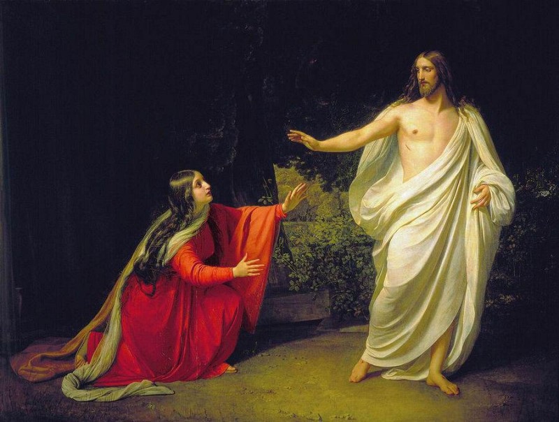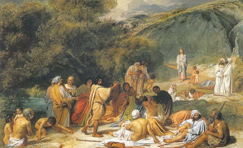 "Картина изображает пустыню на берегу Иордана. Всех видней Иоанн Креститель, проповедующий и крестящий во Имя Того, которого еще никто не видал из народа. Его обступает толпа нагих и раздевающихся, одевающихся и одетых, выходящих из вод и готовых погрузиться в воды. В толпе этой стоят и будущие ученики самого Спасителя. Все, отправляя свей различные телесные движенья, устремляется внутренним ухом к речам пророка, как бы схватывая из уст его каждое слово и выражая на различных лицах своих различные чувства: на одних - уже полная вера; на других - еще сомненье; третьи уже колеблются; четвертые понурили главы в сокрушенье и покаянье; есть и такие, на которых видна еще кора и бесчувственность сердечная. В это самое время, когда все движется такими различными движеньями, показывается вдали Тот самый, во Имя Которого уже совершилось крещение, - и здесь настоящая минута картины. Предтеча взят именно в тот миг, когда, указавши на Спасителя перстом, произносит: "Се агнец, взъемляй грехи мира!" И вся толпа, не оставляя выражений лиц своих, устремляется или глазом, или мыслию к тому, на которого указал пророк. Сверх прежних, не успевших сбежать с лиц, впечатлений, пробегают по всем лицам новые впечатления. Чудным светом осветились лица передовых избранных, тогда как другие стараются еще войти в смысл непонятных слов, недоумевая, как может один взять на себя грехи всего мира, и третьи сомнительно колеблют головой, говоря; "От Назарета пророк не приходит". А Он, в небесном спокойствии и чудном отдалении, тихой и твердой стопой уже приближается к людям". – написал близкий друг живописца, писатель Николай Гоголь, автор книг «Мертвые души», «Ревизор», «Вечера на хуторе близ Диканьки» и других.