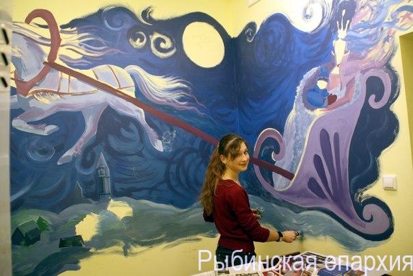 Проект выполнялся на благотворительной основе, поэтому расписывали стены волонтеры, в том числе учащиеся гимназии, а также ученики и выпускники художественной школы города Рыбинска. Меня на участие вдохновила возможность не только нарисовать что-то необычное и монументальное, но и получить опыт взаимодействия с детьми в процессе работы, ведь каждый из немногих студентов, участвующих в росписи, был еще и наставником для младших. Навыки, полученные мной, пригодились позже в процессе моей деятельности как преподавателя рисования акварелью.