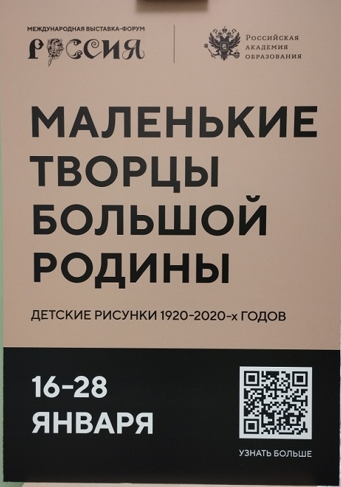 На ВДНХ в рамках работы Международной выставки-форума "Россия" в павильоне № 84 «Дом культуры» 16 января состоялось открытие выставки «Маленькие творцы большой Родины. Детские рисунки 1920–2020-х годов». Открывая выставку, состоящую из 48 работ, президент РАО, академик Ольга Васильева отметила, что основную часть экспозиции составили рисунки победителей Всероссийского конкурса детского рисунка «Россия будущего», а также несколько работ из коллекции Международного собрания детского рисунка Российской академии образования. Выставка наглядно демонстрирует, что детское творчество «способно совершать чудеса», преодолевая границы, в том числе временные.
