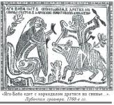 Другое распространённое в эту эпоху лубочное изображение – "Баба-Яга едет с крокодилом драться". Крокодил, изображённый условным знаком в озере с корабликом, – также олицетворение Петра (так его называли в народе), а Баба-яга – царица. Иногда эти персонажи на картинках ссорились из-за бутылки вина. Пристрастие царя и царицы к винопитию и пирам было хорошо известно в народе. Женитьба Петра I на иностранке была воспринята, особенно в старообрядческих кругах, с большой неприязнью. Новая царица представлялась колдуньей, очаровавшей правителя. Как же было не изобразить её в виде Бабы-Яги, да ещё верхом на свинье! Так в народном творчестве отразились противоречия этой эпохи.