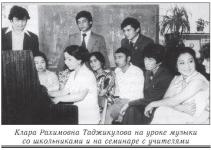 В конце 70-х годов мама открывает для себя новую программу по предмету "Музыка" – программу Д.Б.Кабалевского. Это был один из самых ярких периодов в её педагогической жизни. С огромным увлечением и верой в концепцию новой программы она начала её осваивать. Сильное впечатление на маму произвело личное знакомство с Дмитрием Борисовичем Кабалевским и его единомышленниками – Галиной Петровной Лисенковой (Сергеевой), Эдуардом Борисовичем Абдулиным, Еленой Дмитриевной Критской. Они были новаторами в области музыкальной педагогики. Всесоюзные семинары по изучению программы, созданной Д.Б.Кабалевским, проводились в Москве, и в разных городах Советского Союза: Сумах, Куйбышеве, Свердловске, Баку и др. Настроение, с каким мама училась на семинарах, можно описывать только в восторженных, солнечных тонах. Каждая встреча с учителями разных республик превращалась в праздник единомышленников. У меня сохранились подробные рукописные конспекты Клары Рахимовны с её пометками. Дневниковые заметки, записи впечатлений от выступлений Д.Б.Кабалевского, конспекты открытых уроков, лекций, по которым можно преподавать и сегодня.